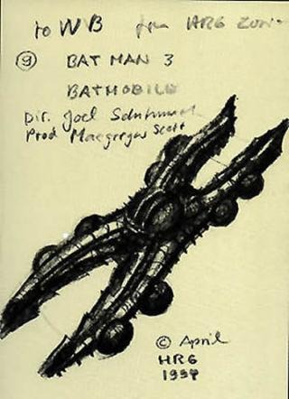 Some of his work was more esoteric, however. Giger designed a Batmobile for 1995's Batman Forever, produced by Tim Burton, which went unused; the car resembled some nightmare starfish, with eight wheels and an outstretched biomechanical chassis.