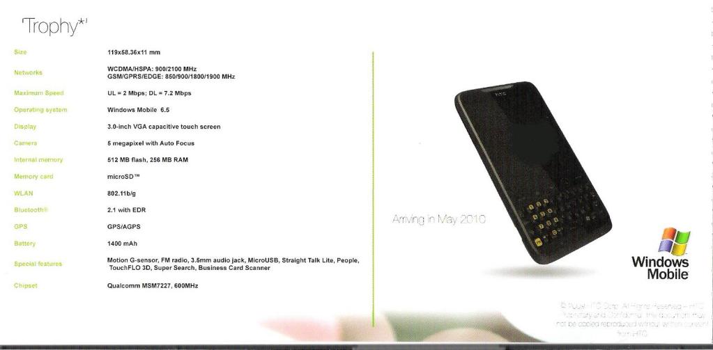 Three Windows Mobile 6.5 handsets occupy this category, the HTC Photon, HTC Trophy and HTC Tera, apparently set to launch in April, May and April 2010 respectively. The Photon has a 3.2-inch HVGA touchscreen, 5-megapixel camera and 600MHz Snapdragon processor, while the Trophy is a QWERTY candybar with a slightly smaller 3-inch VGA display and the same 5-megapixel camera. Finally the HTC Tero has a Touch Pro2 form-factor with a slide/tilt touchscreen revealing a QWERTY keyboard and a 3.2-megapixel camera on the back.