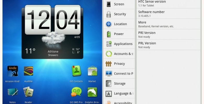 The screenshots give a nice preview of what Android 3.2 Honeycomb with the new Sense UI will look like on the Flyer. It maintains the iconic HTC Sense Flip clock widget, Home and Multitasking button, a modified clock, as well as notification and battery icons on the bottom right of the screen.