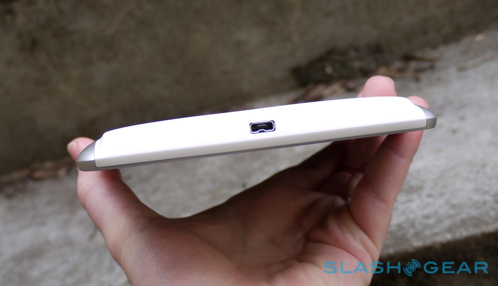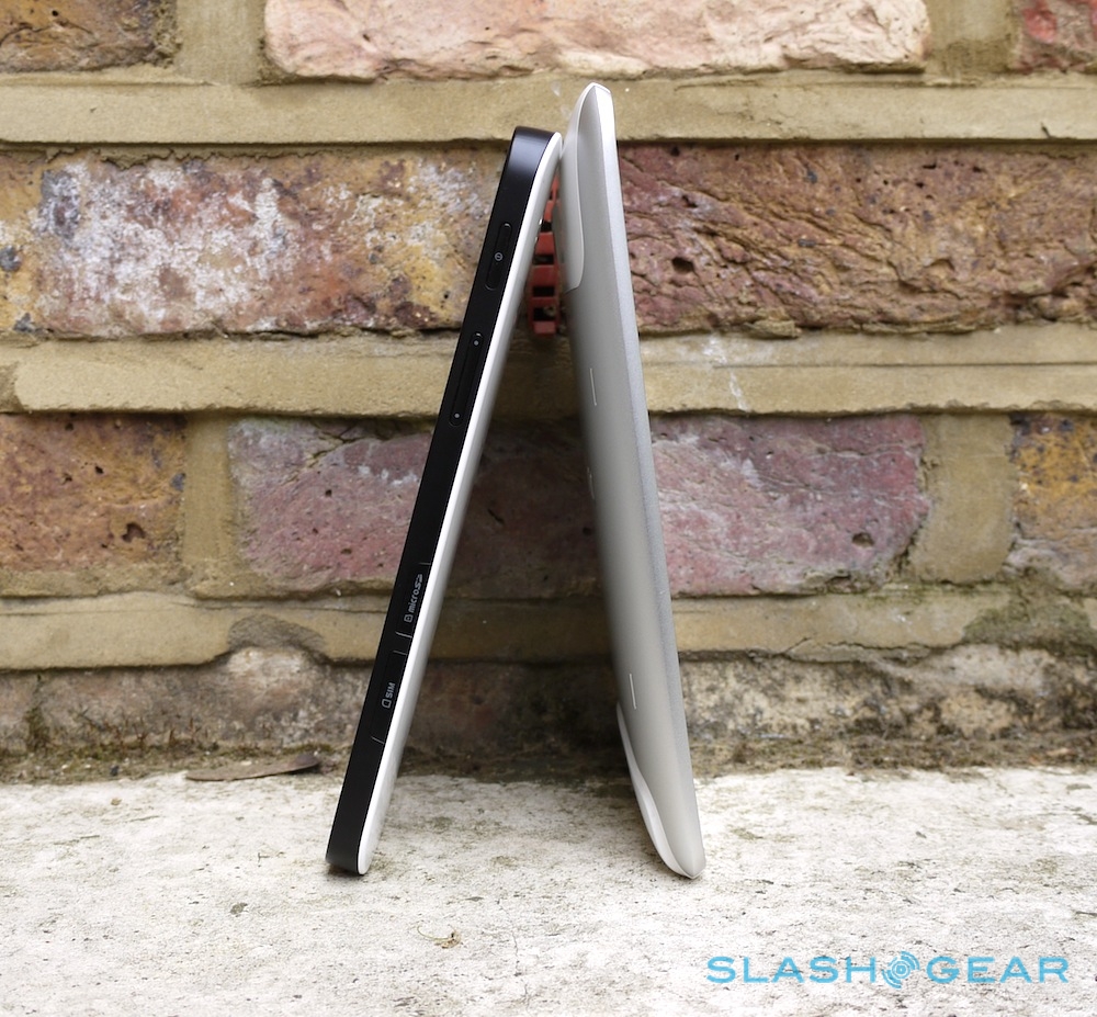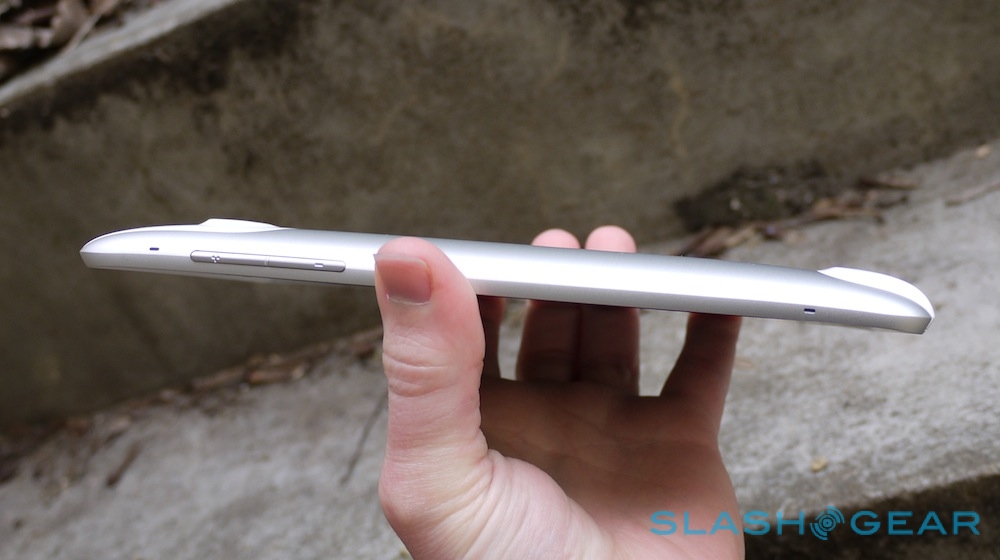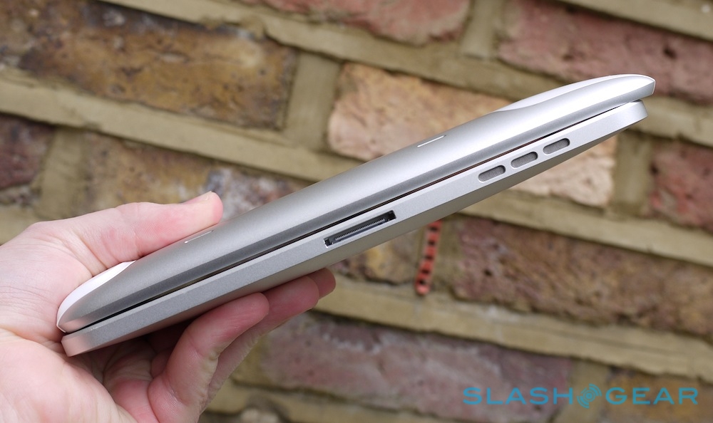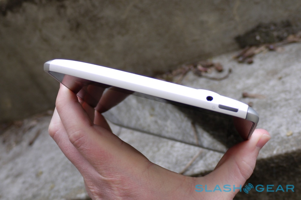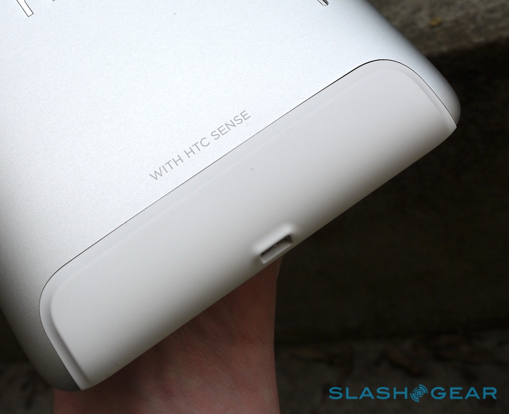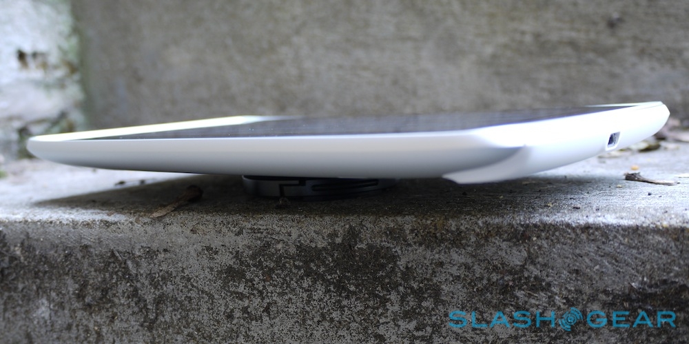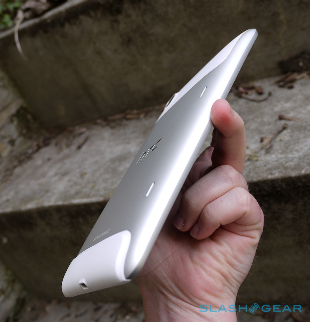 It's certainly not too large to hold in one hand, and in portrait orientation we could easily grip the edges; alternatively, the screen bezel is just the right width to hold the Flyer like a book without accidentally tapping the screen. Physical controls are limited to the power/lock button on the top edge (which also has a nifty integrated status light) and a volume rocker on the right edge; you also get a 3.5mm headphones socket on the top, and a microUSB port on the bottom. The latter can be used with the unusually-shaped plug on HTC's included AC adapter, or with a regular microUSB cable; the Flyer will charge from both, though faster with the former.