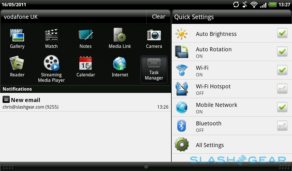 Some of the standard Android software comes into its own on the Flyer. The Car Panel, which offers chunky, finger-friendly shortcuts to navigation and multimedia for use while driving is particularly suited to the tablet's 7-inch display. HTC also throws in Dock Mode, which shows weather, recent FriendStream activity and some app shortcuts (plus has a backlight dim button so that you can use the Flyer as a bedside clock). It can be set to automatically load when you drop the slate in the (optional) dock – which we didn't have to review – as well as optionally turn on WiFi Hotspot sharing as well.