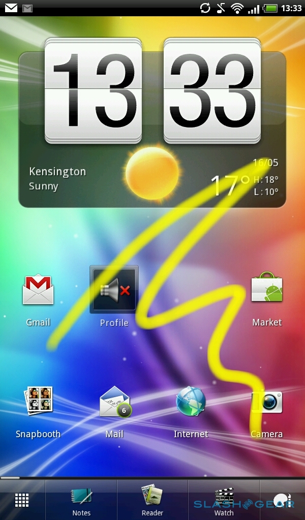 Along the bottom of the display there's the app menu button, then shortcuts for HTC's new Notes app, HTC Reader and HTC Watch, which we'll cover separately later. There's also the usual Customize button, which allows you to change the wallpaper, add icons, shortcuts and widgets – both the standard Google fare and HTC's own – and, for the first time, tweak the lock-screen. That, as we saw on the HTC Sensation, can now show the weather along with four app shortcuts – user assignable, of course. To unlock the Flyer normally, you drag up the large ring at the bottom of the screen; to instantly unlock and load an app, you drag that icon down to the ring. It works well, though we did spot some glitchiness in the animation before the apps loaded.