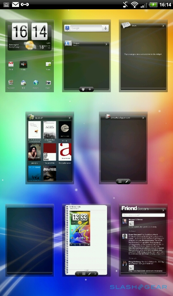 Unlike HTC phones, the Android homescreen now works in both portrait and landscape orientation. Both get a carousel-style interface, with endless rotation; flick the homescreen fast, and the perspective pulls back to show the eight panes spinning. A pinch-zoom gesture shows all eight thumbnailed. It's slick and swift, the 1.5GHz processor showing its grunt. Pull down the notification bar and there are shortcuts to the last ten apps used as well as settings shortcuts and alerts; in portrait orientation the latter are on different tabs, while in landscape they're all visible at once.