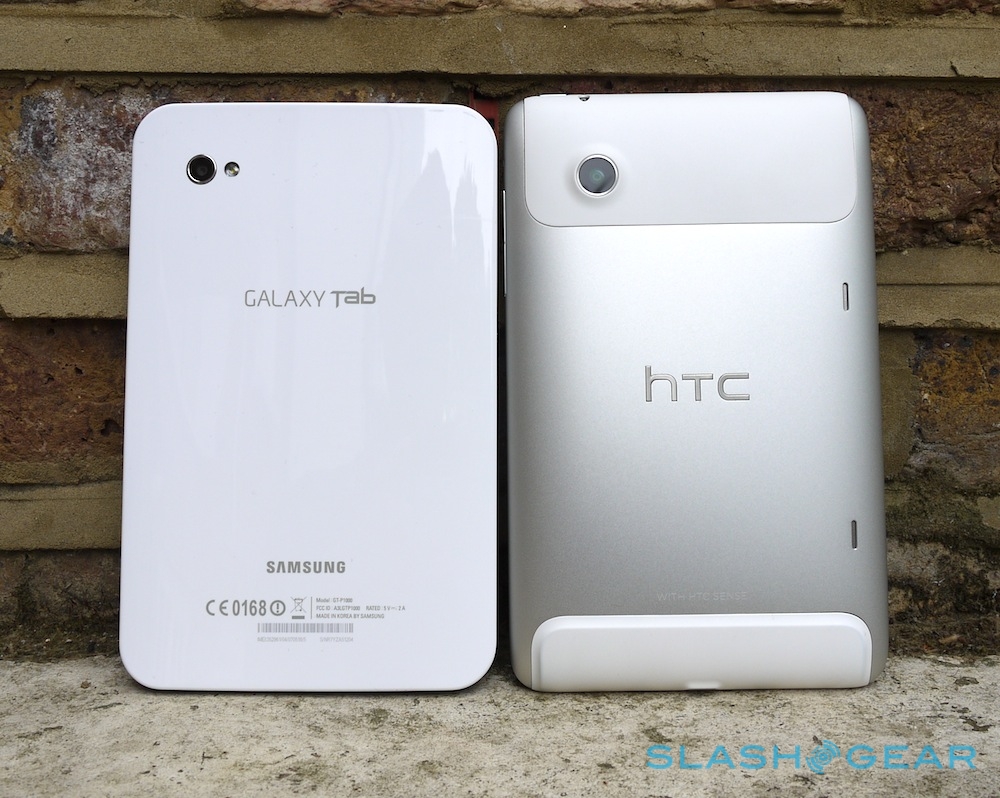 The Flyer's HTC heritage is clear, looking at first glance like an oversized Desire S with its unibody-style aluminum and white plastic insert-sections. It's 7.7 x 4.8 x 0.52 inch chassis is a little longer and thicker than that of the original Samsung Galaxy Tab, and it's heavier as well at 14.82oz. Still, that's because of the metal used in the construction, and the upside is a far sturdier, more expensive feeling slate.