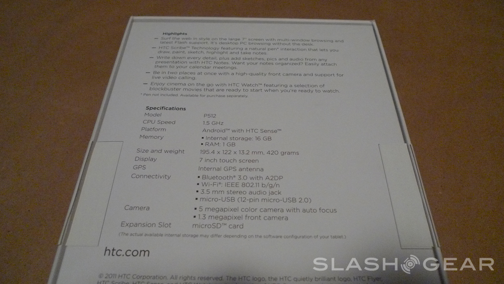 The HTC Flyer we're looking at here is sized at 7.7 x 4.8 x 0.52 inches (195.4 x 122 x 13.2 mm) and weighs in at 420 grams (14.82oz). It has a touchscreen up front, a 1.3-megapixel camera in the top-center of the front when held landscape mode, and there's a Scribe Pen that works specifically with the display's special setup. On the back there's a couple of speakers that are OK, the top panel (portrait mode) pops off to reveal a micro-SD card slot, and the camera on the back is 5-megapixels. A lovely raised HTC sits in the center. There's a 12-pin micro-USB 2.0 jack sitting at the bottom of the device, a headphone jack at the top, and a volume dongle on the side.