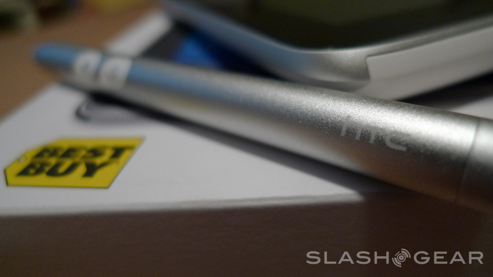 Let's take a look for a bit at the United States' first look at HTC's Flyer tablet. As you may well know by now, there's another version of this device out there by the name of EVO View 4G – have a look at our hands-on with that version of the device from back at CTIA 2011. The device we're looking at here and now is the Best Buy-sold version of the device being here a WiFi-only piece of hardware. This device has a nice silver metal and white plastic chassis, Gorilla Glass front over a 7-inch 1024 x 700 pixel resolution capacitive touchscreen working with a 1GHz single-core processor and Android 2.3.3 with HTC Sense 2.1 for Tablets. And it's got a pen. Is this the writer for you?