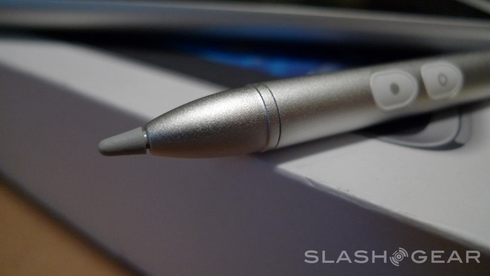 The pen itself is about the size of a large golf pencil or coloring crayon. It uses N-Trig's active digitizer technology to create a smooth experience for you that relies not just on the touch of the pen to the screen, but the pressure with which you press. Once you start using the pen you'll find that this sensitivity will come in handy, especially once you become proficient in the many varieties of brushes and pens and colors and weights.
