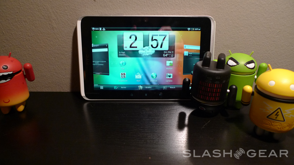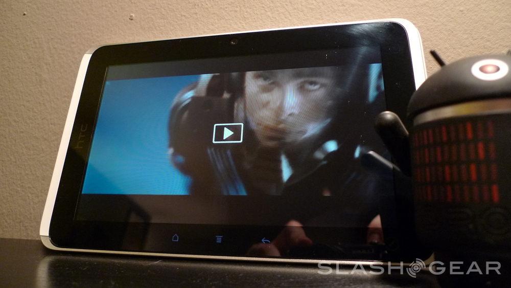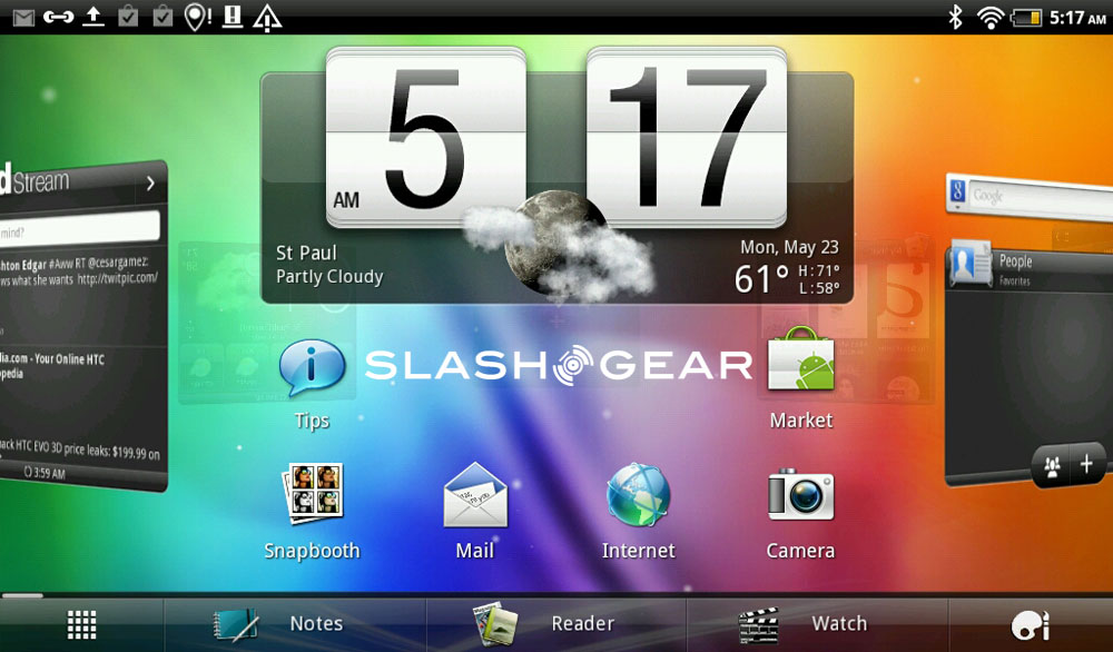 Is it good? Is HTC Sense 2.1 for Tablets good? Sure it's good, silly, it's a nice little system with multiple large screens in mind, widgets that fill full homescreens and show you things like small Weather, People + Google Search, Watch (movies you can download via HTC's Video store – a feature you can use even if you don't want to watch full videos by selecting your video of choice and watching a full trailer – fun!), My Shelf (containing books from Kobo, run by Adobe), big Weather, Mail, and Friend Stream.