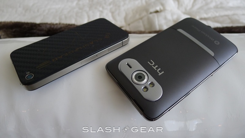 In your hand, the HD7 and iPhone 4 are both comfortable in their own right. However, the size of the HD7, and the fact that while the device may be almost as thin as the iPhone 4, there's a rounded back, may make it hard for some with smaller hands to hold the Windows Phone 7 smartphone comfortably. The flat-back of the iPhone 4 and its more "modest" size may make it more approachable to some. But, the HD7 does indeed come with a kickstand, which will make it easier for those watching a movie to enjoy it, by setting it down on a flat surface.