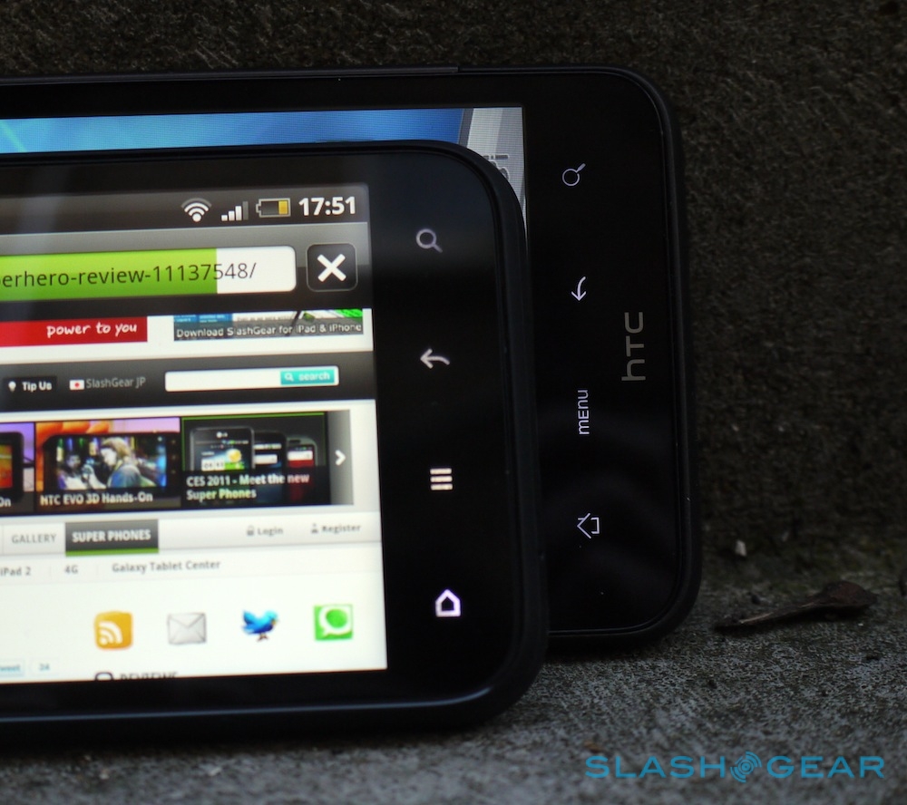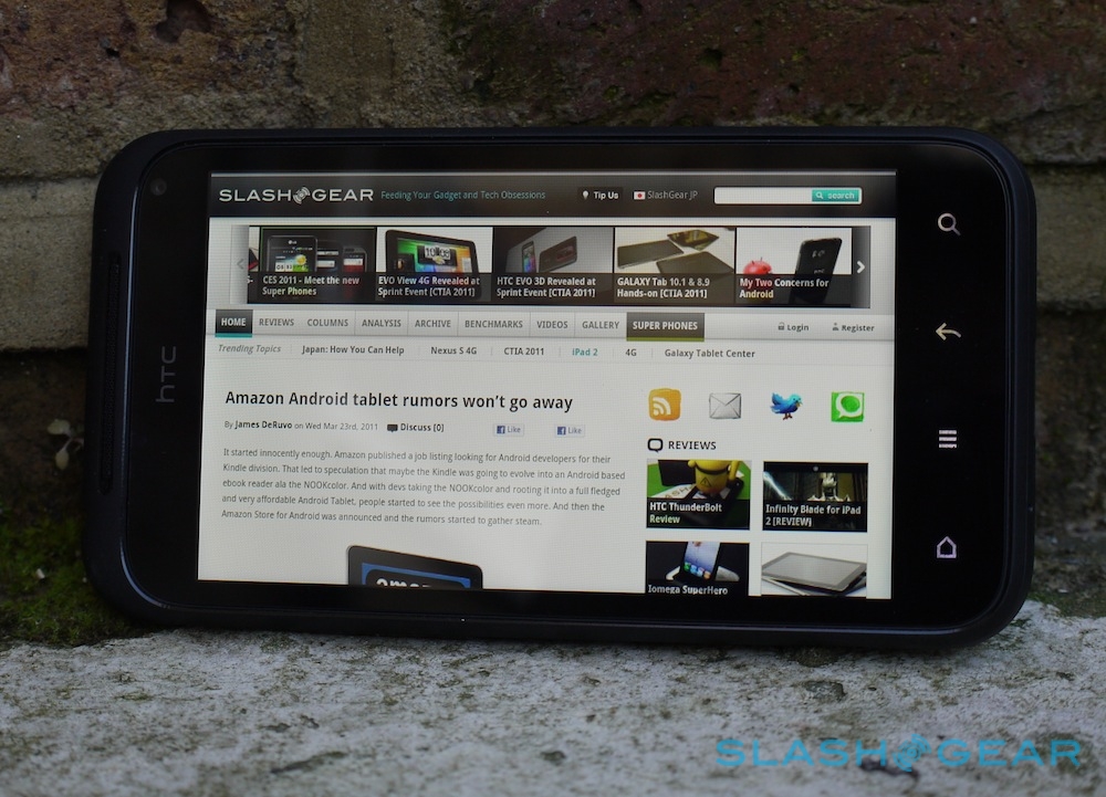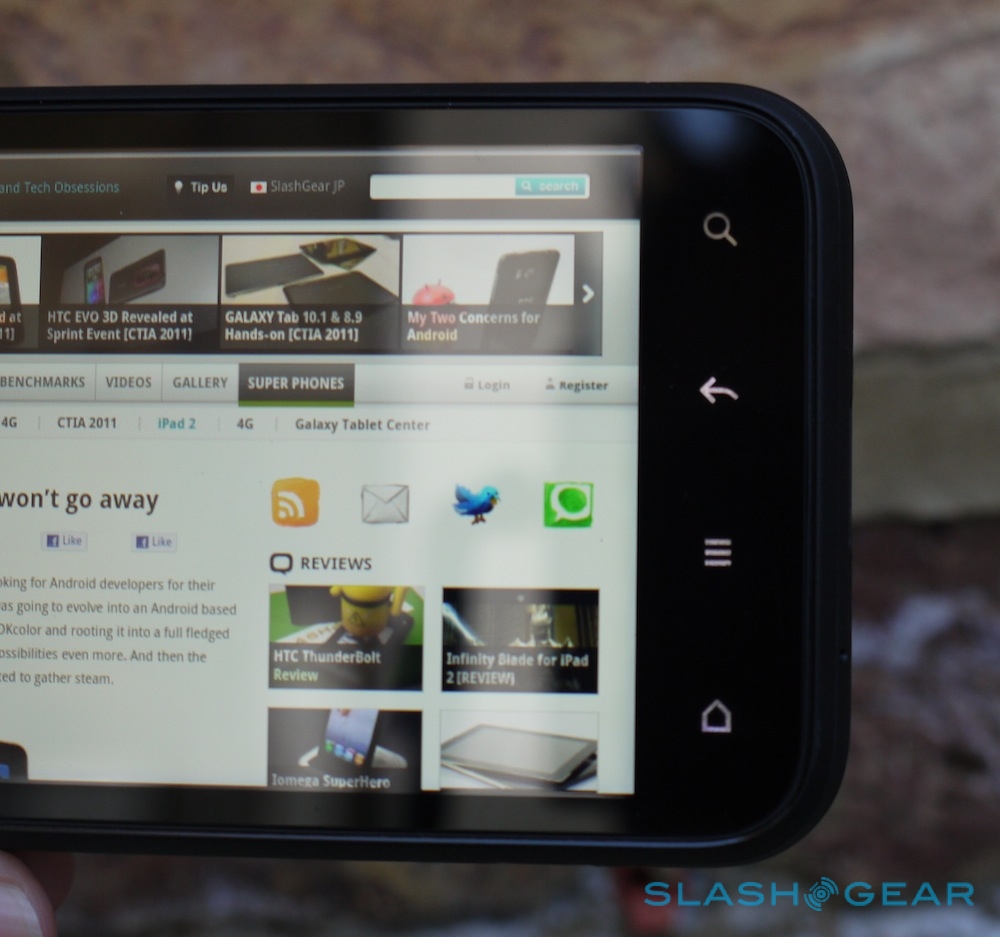 Up front is a 4-inch WVGA 800 x 480 touchscreen with a 1.3-megapixel camera LED indicator light. The panel itself is a Super LCD with bright colors, decent saturation and generally strong performance; despite lacking qHD resolution, like the EVO 3D, on-screen graphics generally look smooth and crisp. Underneath is the usual row of touch-sensitive buttons for home, menu, back and search. Unusually, though, the button legends rotate when you flip the Incredible S 90-degrees counter-clockwise. It's reasonably pointless but entertaining nonetheless, and a good gimmick to show friends. On the left edge is a volume rocker and microUSB port, though HTC still refuses to add a dedicated camera shortcut to the other side.