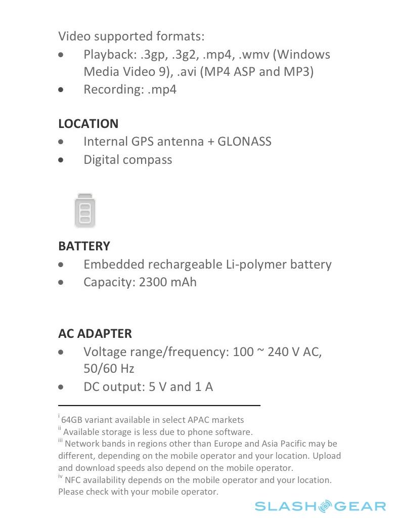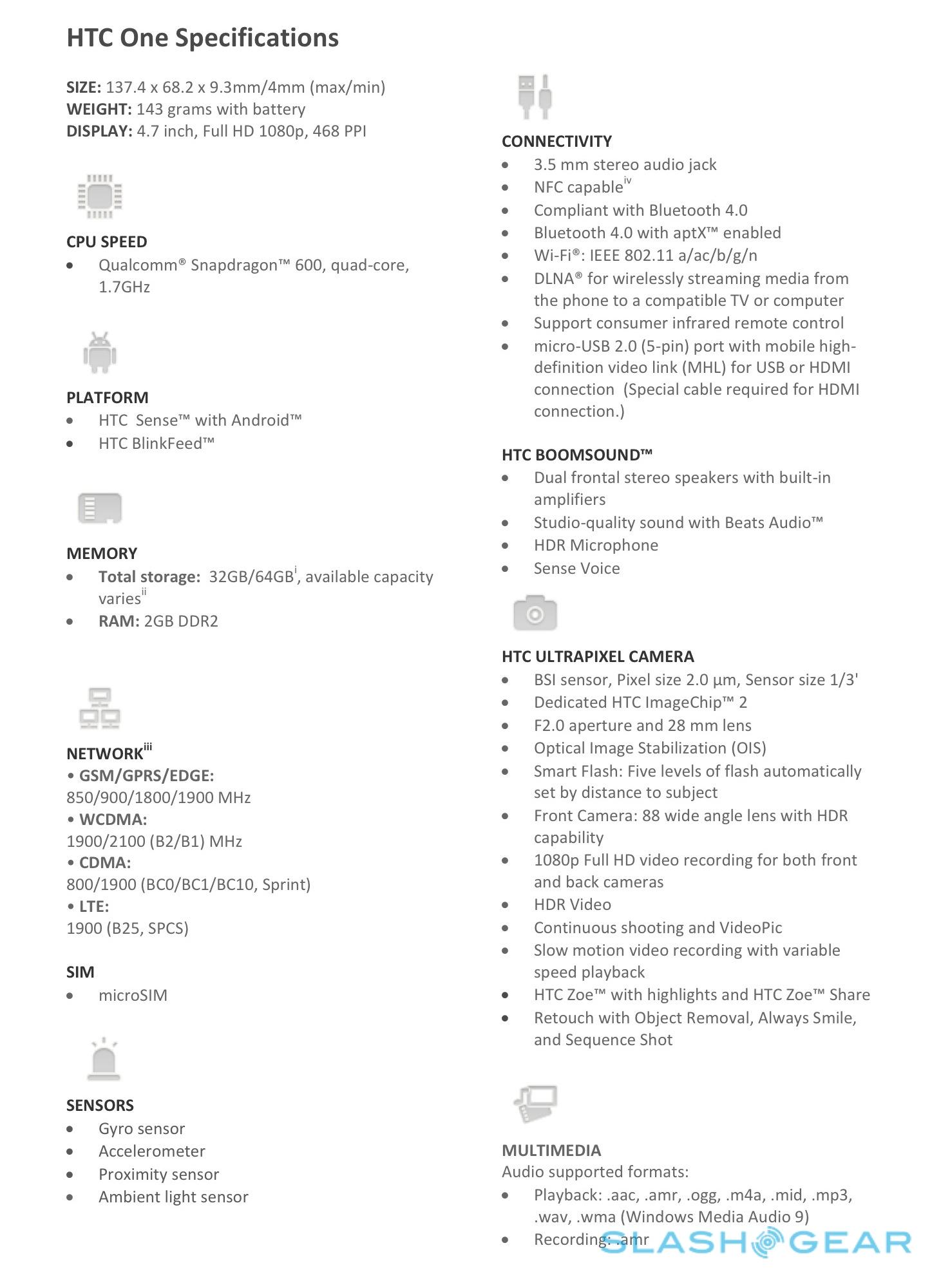 Otherwise, all the boxes are ticked. There's LTE support (800/1800/2600) as well as HSPA+, WiFi a/b/g/n, Bluetooth 4.0 with aptX, GPS/AGPS/GLONASS, and the usual array of sensors: motion, digital compass, gyroscope, and ambient light detection. The quadcore processor is paired with 2GB of memory and either 32GB or 64GB of internal storage (though, in the UK and Europe for instance, HTC doesn't have immediate plans to offer the larger-capacity version); no microSD port, however, and the 2,300 mAh battery is non-removeable.