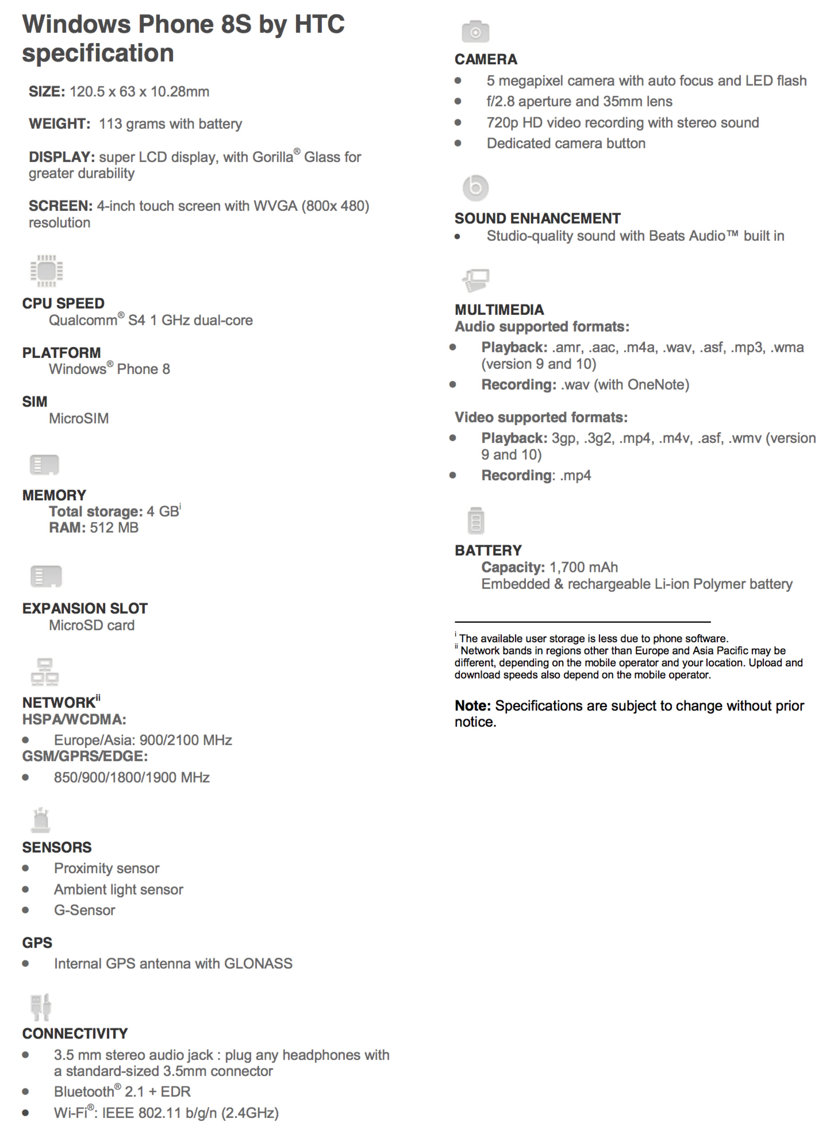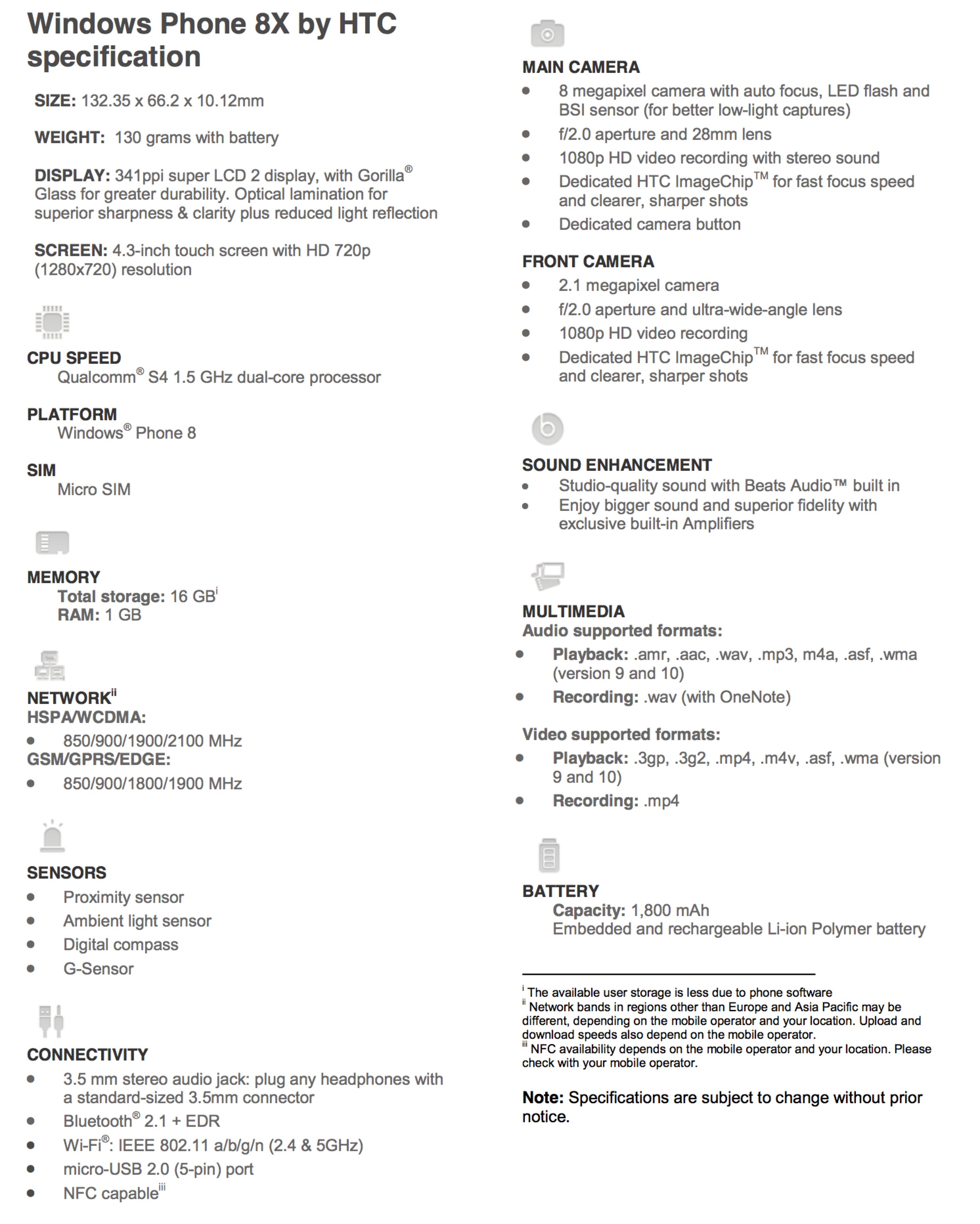 The 8X also includes Gorilla Glass and an optical lamination touchscreen, 16GB of internal storage (though no microSD card slot), WiFi a/b/g/n, NFC, Bluetooth 2.1+EDR, and the usual digital compass, GPS, and other sensors. North America will get LTE versions, while EMEA will get HSPA+/DC-HSDPA models.