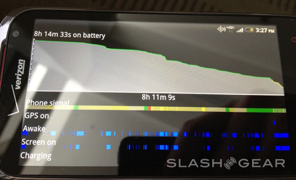 Battery life, with LTE turned on and regular use of push-email, browsing, navigation, IM and some media playback came to 8hrs. Turning LTE off and only enabling it when needed pushed that out to the normal nightly-recharge cycle most smartphones can achieve. We're still yet to see an LTE phone that can deliver both runtimes and data speeds without demanding a car battery scale power-pack, but the HTC Rezound does better than others we've seen.