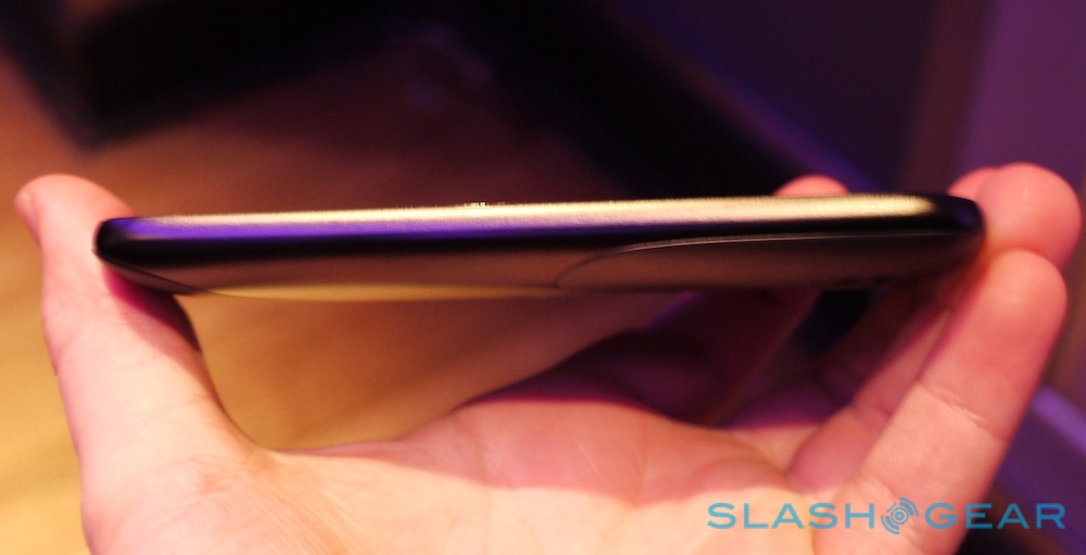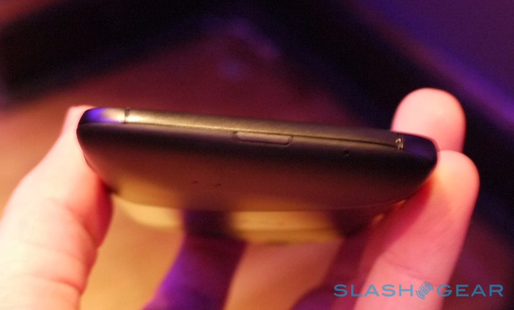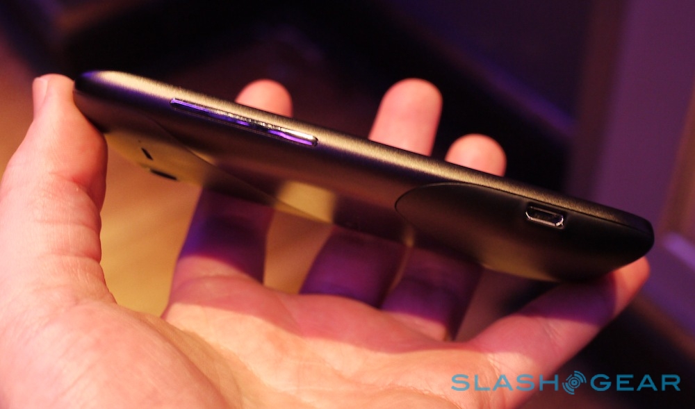 The unibody design skirts the line between solid heft and lightweight convenience, and is creak free; that's helped by the fact that the back panel and edges are one solid piece, into which the screen section slots. The microSD card slot (though not the SIM slot) can be accessed without removing the battery. Ports and controls are limited to power/lock on the top, next to a 3.5mm headphone socket, and a volume rocker and microUSB port with MHL HDMI support on the side; there's no dedicated camera shortcut key.