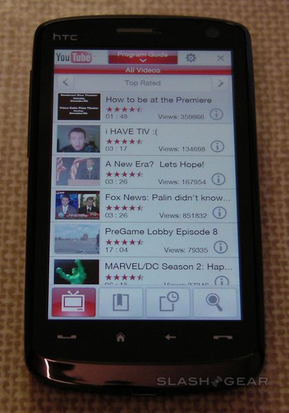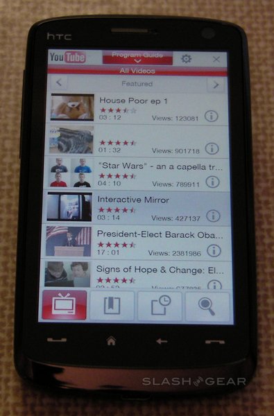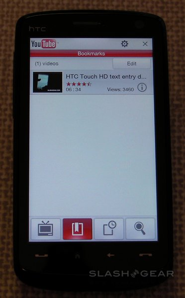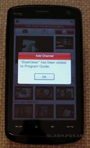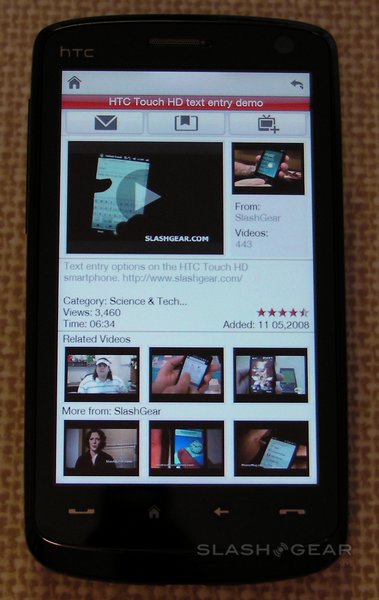 Select a clip and the screen automatically rotates to landscape and it begins downloading. Alternatively, hit "i" and there's an overview page, with text summary, upload details and star rating. While there's no way to rate the video on the Touch HD itself (in fact you can't log into your YouTube account at all) you can add them to the handset's bookmarks, add the channel to your program guide, or send the link by email, MMS or SMS message. The info page also shows thumbnails of three related videos and three further videos from the same channel.