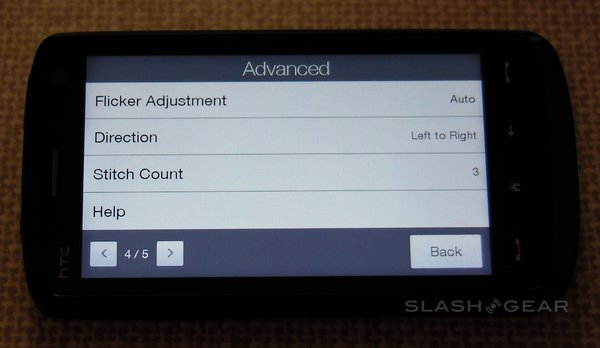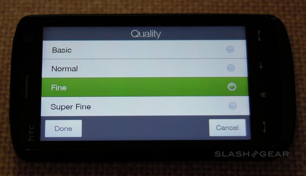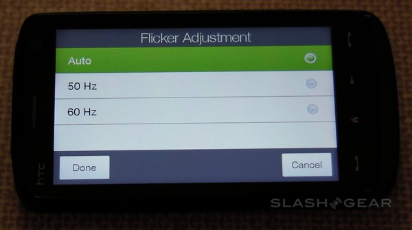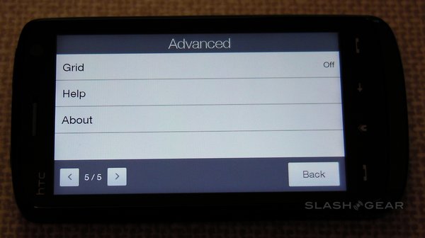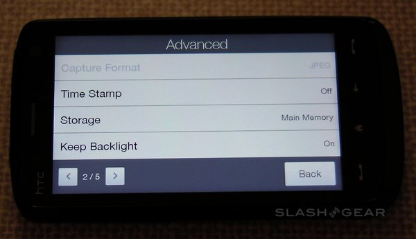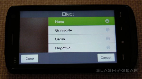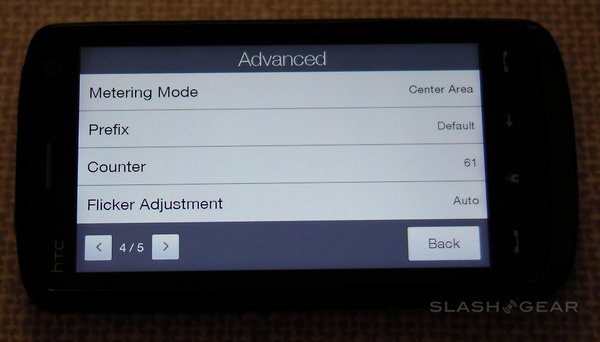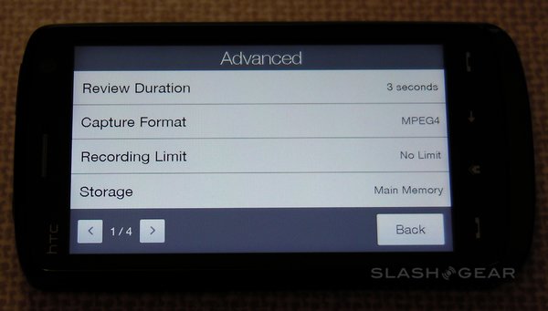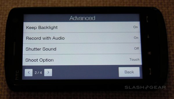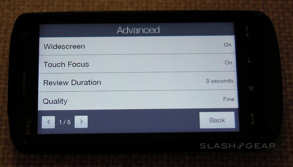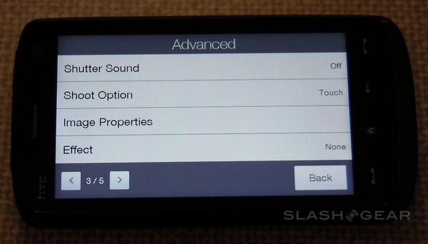 Among the advanced settings are image effects – grayscale, sepia and negative – the option to switch metering mode between the center and the overall average, flicker adjustment (auto, 50Hz and 60Hz) and an optional on-screen grid. A preset menu lets you change between normal still images, normal video, photo panoramas, MMS-quality video, contact-size images and "fun" frames (such as fake magazine covers). There's no optical zoom, but the Touch HD does have a digital zoom (that, as always, sacrifices quality for close-up).