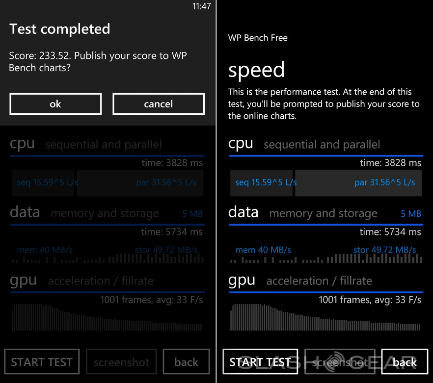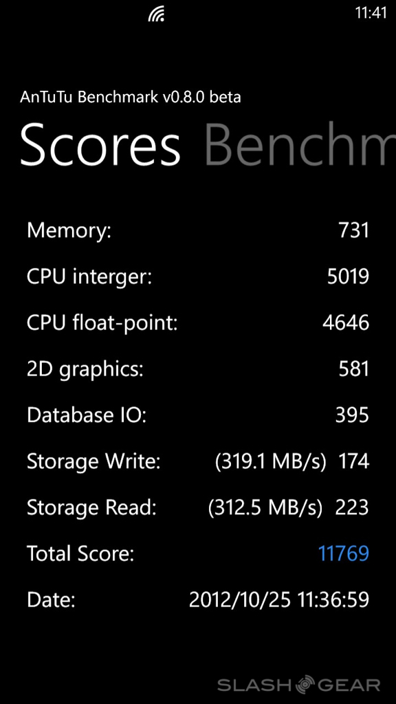With WP8 performance has been seriously improved. As you saw from my various videos above the user interface is extremely crisp and fluid in its actions. From resizing tiles, opening apps and games, changing theme colors device-wide and more everything is snappy. This is in part to the new, improved, and efficient Windows Phone 8 — but you can't forget that dual-core processor is under the hood either. While benchmarks aren't as popular as say, our Android friends with quad-cores, here's a few just for good measure. AnTuTu has made its way to WP and we scored nearly 12,000 here. Once more start using AnTuTu we can really measure performance. Then for fun we ran a quick test of WP Bench, and you can see those results below for an idea of just how fast Windows Phone 8 and this dual-core really is.