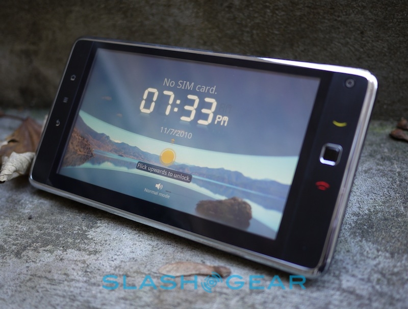 As we saw back at IFA 2010, the Huawei S7 has a 7-inch touchscreen and a sturdy, discretely designed chassis. Unlike the 1024 x 600 resolution capacitive panel on the Galaxy Tab, the S7 makes do with a WVGA 800 x 480 display and a resistive touchscreen; there's a short stylus in a slot on the side. Physical controls include home, menu and back buttons down the left bezel (they look like touch-sensitive keys, but they're actually real buttons) and call/end buttons on the right bezel, flanking an optical trackpad.