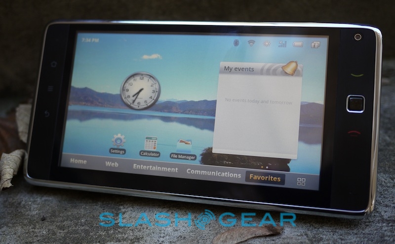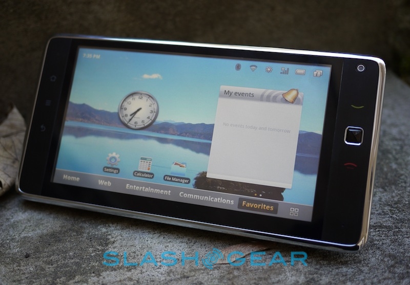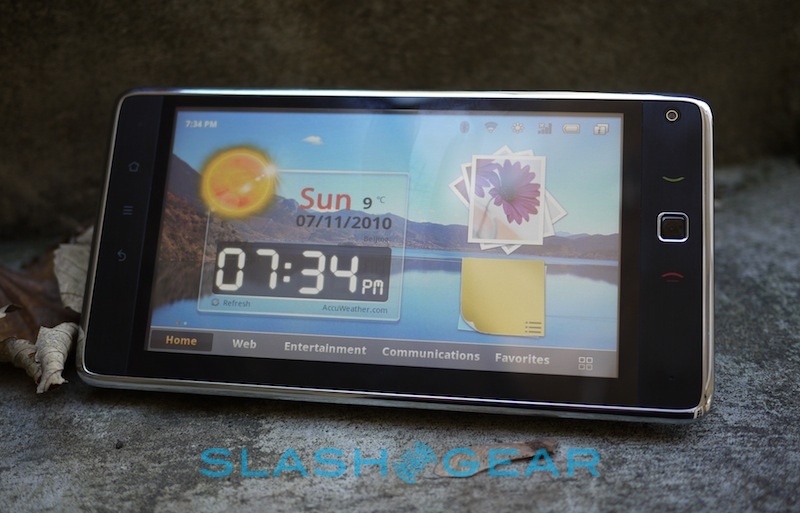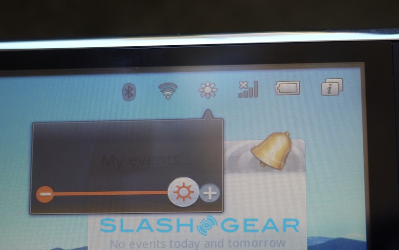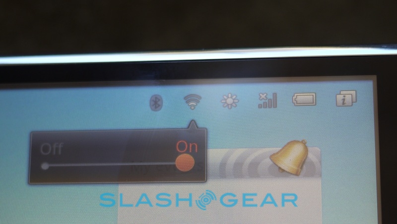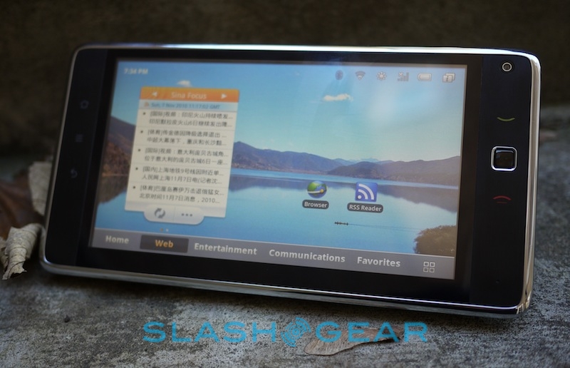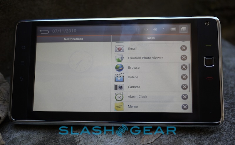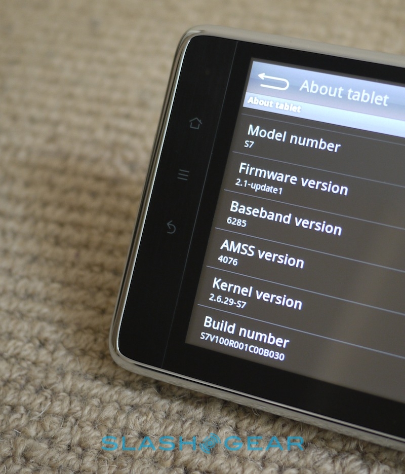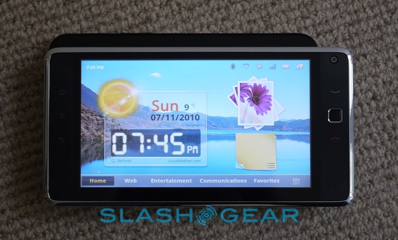 Huawei has used Android 2.1 Eclair on the S7, rather than 2.2 Froyo, complete with a customized UI to make it more tablet-friendly. Unlike Samsung, with their various custom apps for the Galaxy Tab, the S7's modifications are limited to the homescreen; there are five homescreen sections – Home, Web, Entertainment, Communications and Favorites – each with two panes for widgets and icons, and the app menu button has been shifted to the bottom right hand corner. Along the top of the display, the usual Android notification bar has been replaced with a row of icons: there's a clock on the far left, then controls for Bluetooth, WiFi, brightness, mobile signal, battery and Huawei's task switcher.