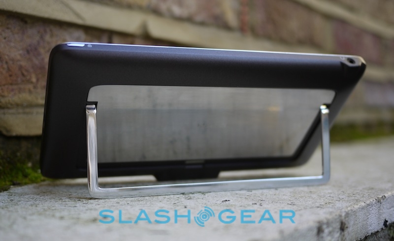 On the left edge there's a volume rocker, while the power button is on the top right corner. Ports, meanwhile, include a headphone socket on the top left, power and microUSB on the right edge, and a microSD card slot and proprietary docking connector on the bottom. There's no camera on the back, unlike the Galaxy Tab, but you do get a front-facing 2-megapixel webcam for video calls. A useful addition is the flip-out kickstand which can prop the S7 up at a useful angle for watching videos.