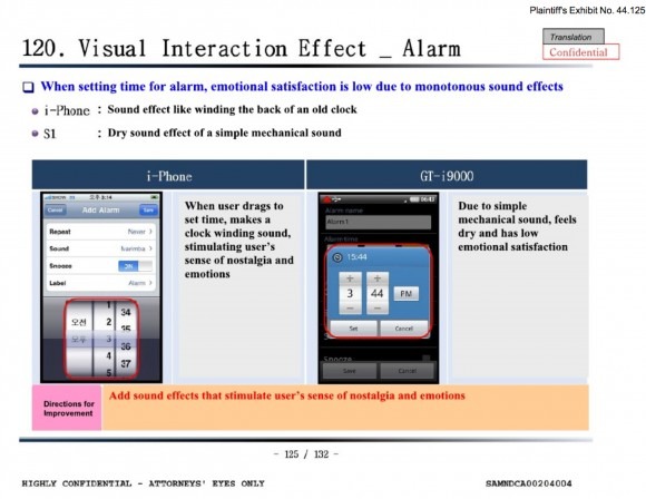 "There is no feeling of receiving light, and deficient feeling of softness in the curvature of icon corners" one section of the report concludes of the Galaxy S, suggesting that light effects should be added to the TouchWiz interface but pointing out that designers should "remove a feeling that iPhone's menu icons are copied by differentiating design." The authors don't stint on detail, either; for the alarm setting, Samsung's "dry sound effect" of clicking through the desired time is criticized, versus iOS' retro clock-ticks, and prompting the suggestion that the designers "add sound effects that stimulate user's sense of nostalgia and emotions."
