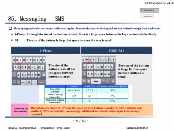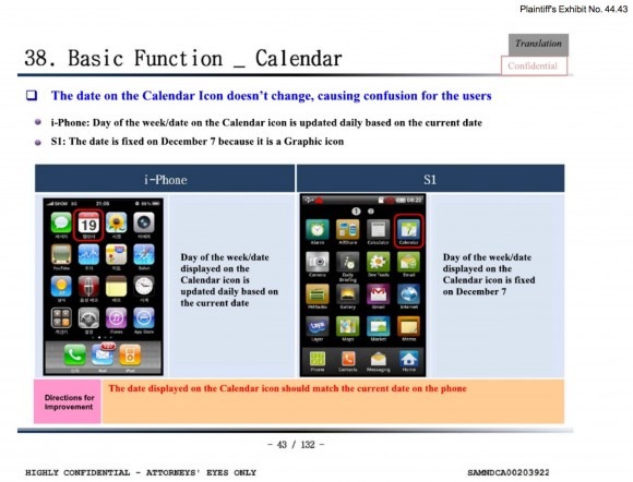 Although feature comparisons between rival devices are commonplace, it's perhaps the detail to which Samsung goes that makes the document so dangerous. At one point, the company measures the exact distances between key rows and individual keys, concluding the precise amounts by which it should rearrange its keyboard. Another page highlights iOS' Calendar icon and the fact that the date changes to match the current date, suggesting that Samsung's icon should do the same.