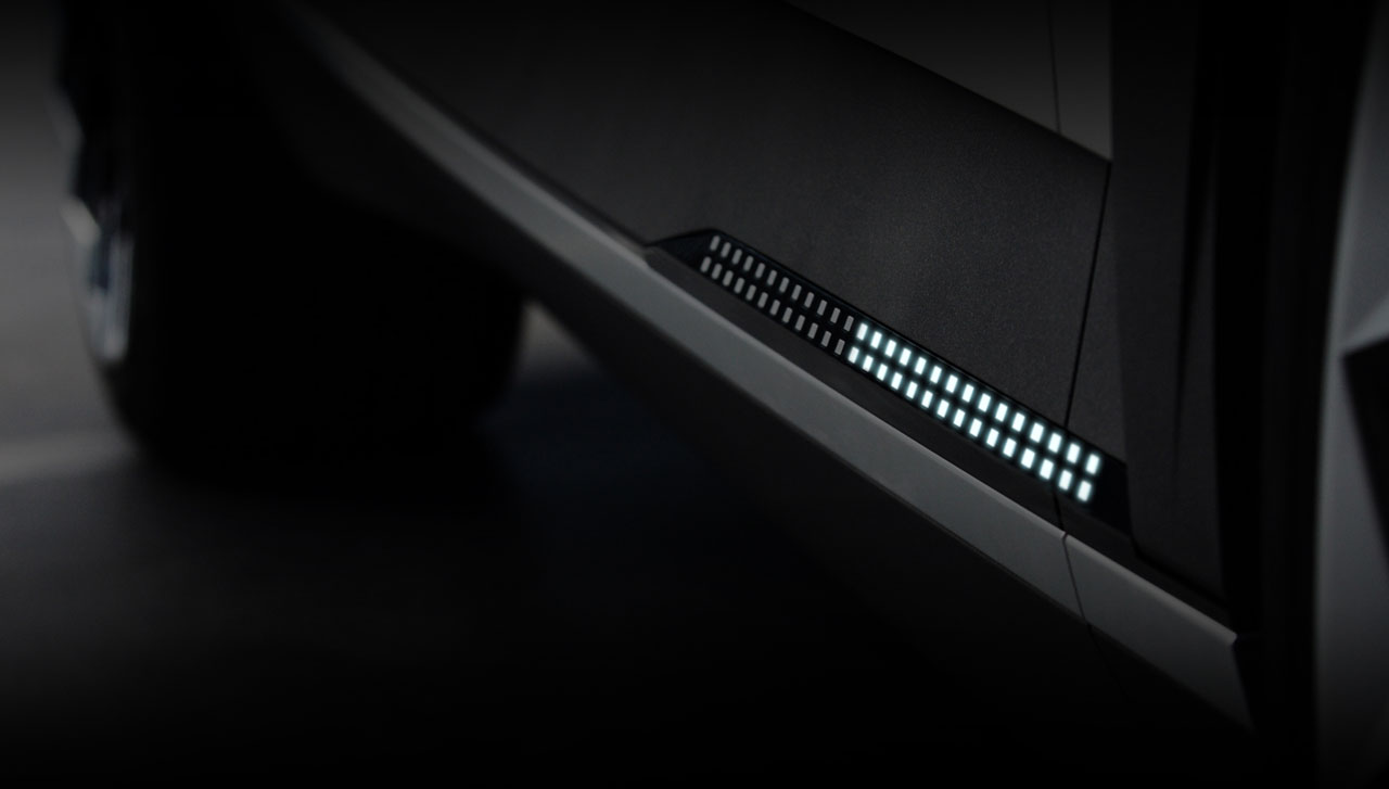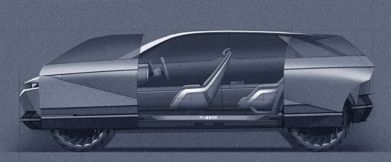 The 45 concept is a fully electric vehicle with the battery and motors positioned below the passenger compartment. The interior is designed to be a comfortable and communal place with lounge chair-style rear seats and front seats that can rotate to face passengers. The infotainment system uses a projection-beam interface.