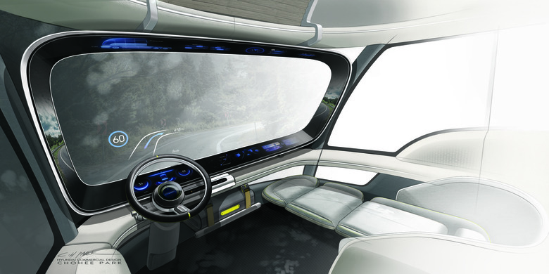 Inside, meanwhile, it's a high-tech paradise. The spacious cabin is perched right at the front of the truck, studded with glass so that visibility of the corners is about as clear as it could be. For those blind-spots that still exist, Hyundai designer Chohee Park has added integrated displays, which beam live video from cameras around the HDC-6 Neptune to sections of the windshield frame.
