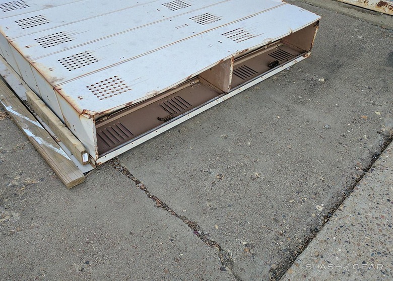 Up front of the school was a set of lockers thrown face-down unto the ground. Also there was a bathtub, and the faint sound of a dog barking. Not barking outside, chained up by a house, but inside. Inside the boarded-up school.