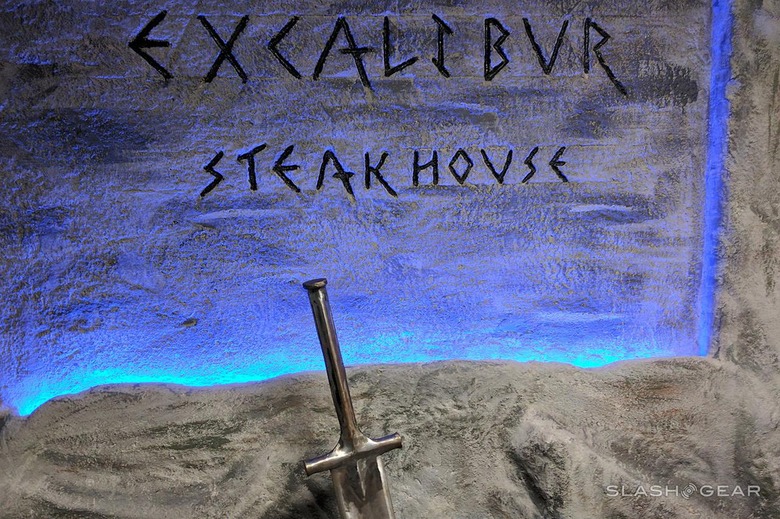 Further down the hall we came upon the restaurant Excalibur (steakhouse), complete with its own sword in the stone. The name of the restaurant is hewn into the living rock. With bright LED lights lighting it up to exemplify its beauty.
