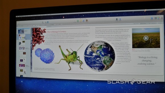 Text can be typed in directly, with the usual choice of fonts and styles, or imported wholesale by dropping a Word document into the editor. Similarly videos and images can be dragged in, and Keynote presentations automatically covert into interactive clipboards. What stands out the most is the speed at which content renders and is ready; Apple was demonstrating iBooks Author on some high-spec iMacs, which will give it an edge of course, but there's little in the way of sitting round waiting for video to import or graphics to be crunched.