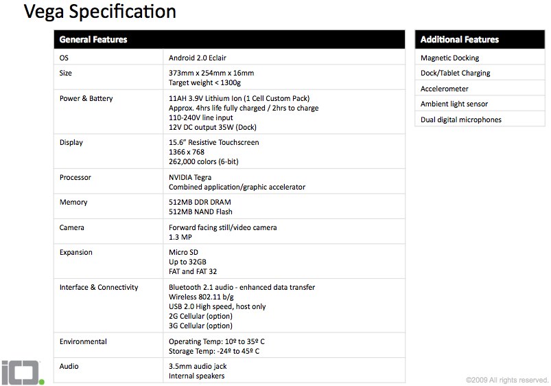 Other specifications include 512MB of RAM and 512MB of NAND flash; primary storage is via microSD card. There's also a 1.3-megapixel webcam, dual digital microphone array, ambient light sensor and accelerometer, plus a 3.5mm headphone jack. The whole thing measures a neat 373 x 254 x 16 mm, and there'll be a clever desktop docking station onto which the Vega magnetically attaches and then automatically charges. Battery life is expected to be around 4hrs; full specifications in the gallery below.