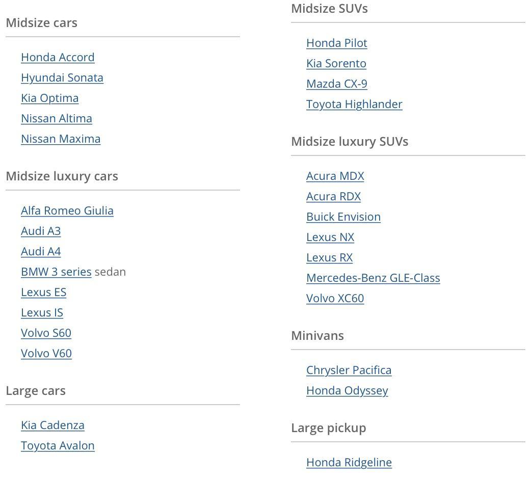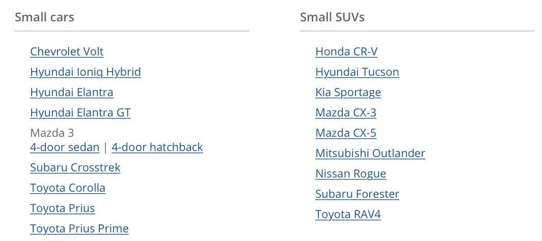 Still, if you're willing to compromise on the new tests, you have a lot more choice. The TOP SAFETY PICK award has almost the same requirements in crash protection – including the driver-side small overlap front test – but doesn't include the passenger-side version. It also allows for an acceptable headlight rating. Then, you get 47 more options.
