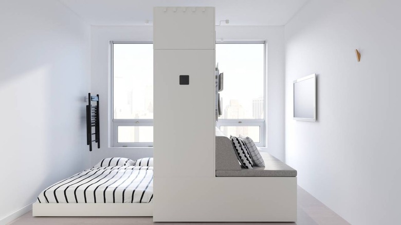 The goal was to avoid furniture taking up space when it's not actively being used. "Instead of making the furniture smaller, we transform the furniture to the function that you need at that time," Strawn says. "When you sleep, you do not need your sofa. When you use your wardrobe, you do not need your bed etc."