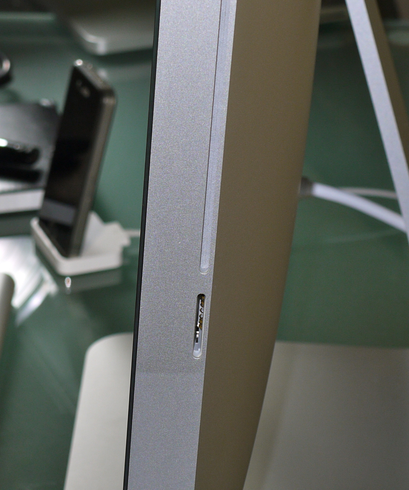 Everything is wrapped up in what's perhaps the slickest chassis in Apple's line-up today, a smooth unibody aluminum expanse with a simple one-legged desk stand. Opt for the included wireless peripherals and a WiFi network connection and you can hook up the iMac with a single cable, for power, which snakes neatly out through a purposefully cut hole in the leg. Up front, most noticeable is the 16:9 aspect 27-inch IPS LCD panel, running at 2560 x 1440 resolution with 375 cd/m2 brightness and 1000:1 contrast ratio. Hidden behind the glass bezel is an iSight webcam, a microphone and an IR port for use with the optional Apple remote, while underneath are stereo speakers each paired with a 17W amp.