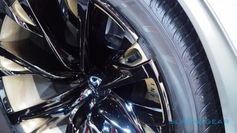 If there's a saving grace among the heft it's some of the detailing. The door handles are normally flush with the bodywork, popping out when needed; it's a neat visual element but also helps with aerodynamics and cuts wind noise. 24-inch wheels have typical auto show scale, but Infiniti makes them look more like 26-inches by having the outer edges of the wheel overlap the tires; the result is an SUV that looks as though it's running on skinny, low-profile rubber, without the compromise in ride quality.