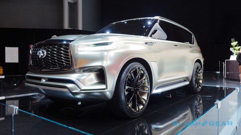 Infiniti may be best known for its curvaceous Red Sport coupes and sedans today, but the automaker is looking to step up its game in the luxury large SUV segment wth something very much like this, the Infiniti QX80 Monograph. Described as a "design study" for the New York International Auto Show 2017, the bold SUV won't see a launch as-is, but cues are likely to appear on whatever Infiniti brings to market. If the response is good, though, there's a fair chance that some of the bolder elements.