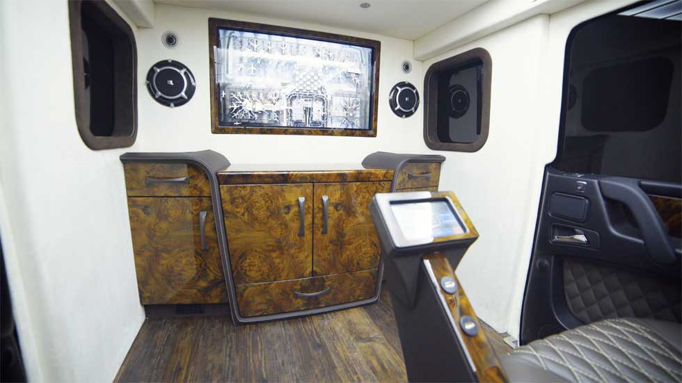 The interior looks like a living room with two large easy chairs sitting inside. The forward bulkhead has a 4K TV and surround sound speakers are arranged all around the rear cabin. The armor is capable of surviving hits from 7.62mm NATO rounds and the undercarriage can survive blasts from DM51 hand grenades.