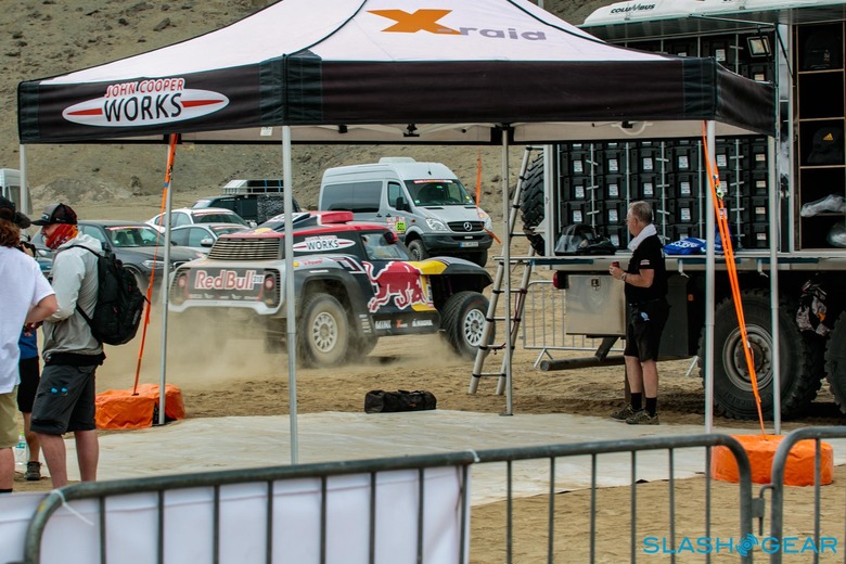 Security was tight, and we quickly parked our MINIs and made our way past the gates into the X-RAID section of the camp. Somehow, even despite our two hour head start, the crew had made the journey much quicker, arriving well before us and establishing the camp. With the support trucks a protective horseshoe around the MINIs staged inside, it's felt like a thoroughly modern campground. Each car has its own support truck, engineer, and mechanics. There was a total of 150 staff to support the X-RAID effort.