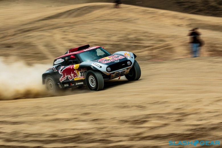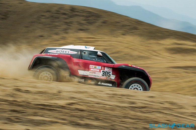 We rolled out of the staging pit, launched over the hill, and onto the gravel. Bryce expertly drove through the twisty roads, their loose surfaces scattering as we reached speeds around 160 km/h (99 mph). Despite the conditions outside, the buggy's interior was surprisingly comfortable. MINI seals it from the ever-present dust, while the air conditioning is a hard-working essential feature. The only noise, indeed, was the faint sound of the diesel engine and the suspension churning away.