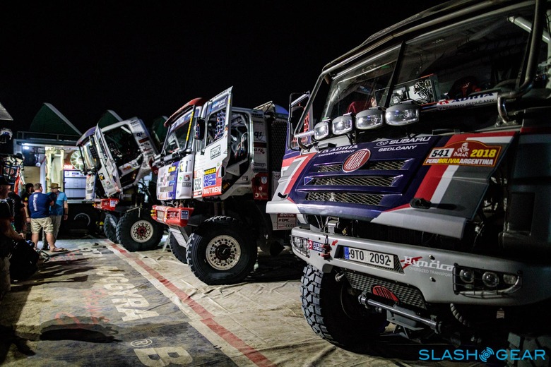 It's an occupational hazard on a race like Dakar, and it underscores just how much rests on the shoulders of the driver and navigator. When something goes wrong while they're out on the course, they're the only people who can work on the car. Far from the cluster of mechanics and engineers in the bivouac, it's an altogether more ad-hoc business. The cars have built-in air jacks to raise them off the ground when necessary; they carry 2-3 spare wheels depending on the vehicle, and a few small spare parts. When there's significant damage, they need to wait for the race truck that's also entered into the competition: it carries enough parts to build a whole new car. In a worst-case scenario, another car is able to tow the damaged vehicle to the final time control station, and into the bivouac.