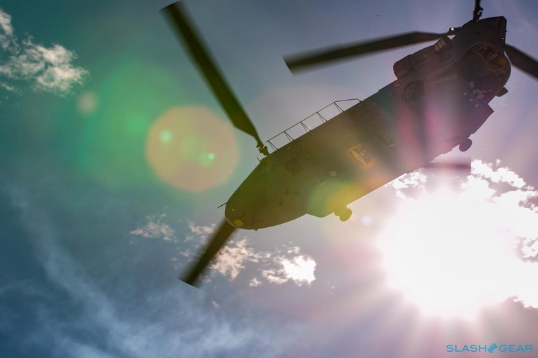 Outside, in the typical fashion, the United States flag is delivered via skydivers, there's a flyover of US Army Apache and Chinook helicopters, and finally The Star Spangled Banner helps kick off the race. The starting grid is filled with cars, mechanics, engineers, and of course the drivers, all making sure that the cars are as perfect as possible. Even this close, there are plenty of small changes being made, and tire choices are being verified. The safety car rockets away from the front of the grid and cars take off for one reconnaissance lap.