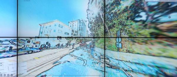In contrast, Nokia's system grabs photography and LIDAR from all directions simultaneously, and is in effect able to generate stereo panoramas while on the move. The HERE team can also colorize the LIDAR graphics in real-time – useful for car manufacturers, who might want their own unique on-screen aesthetic to match the rest of the dashboard – and apply effects like pen & ink.