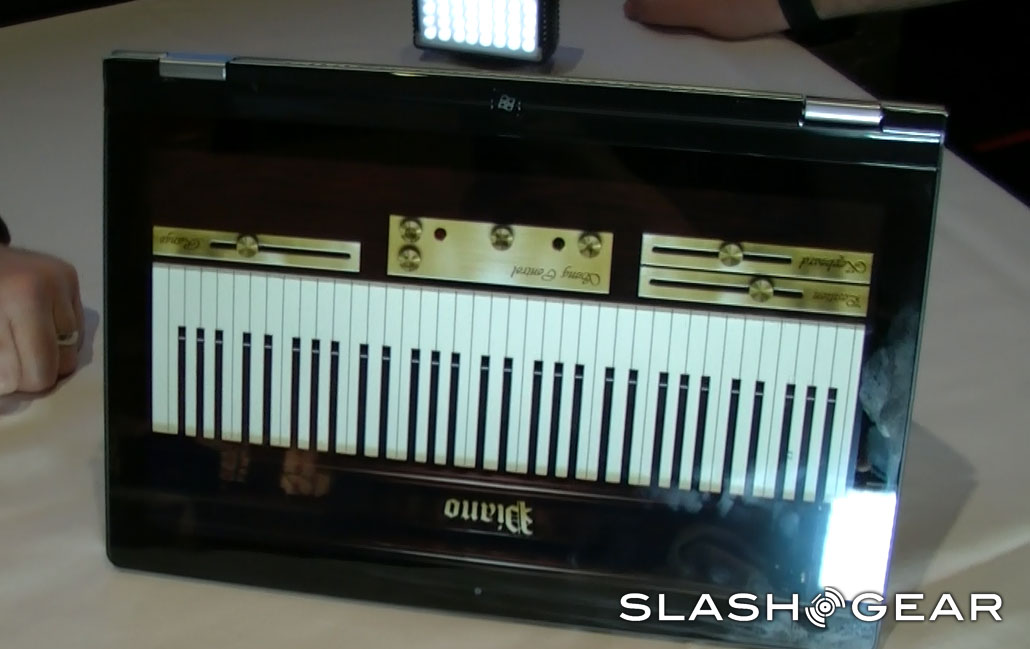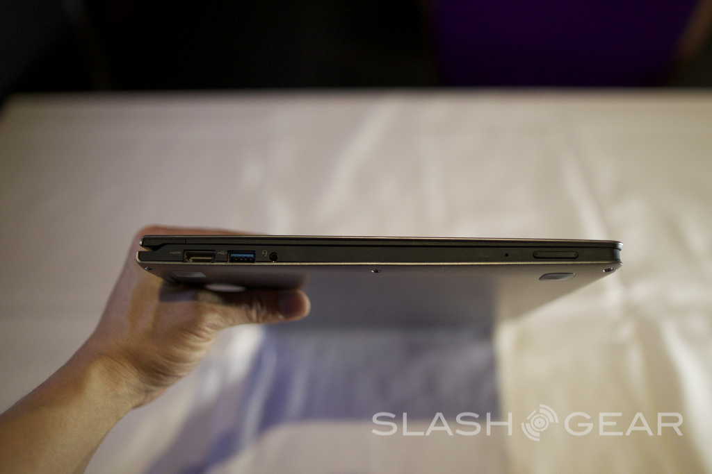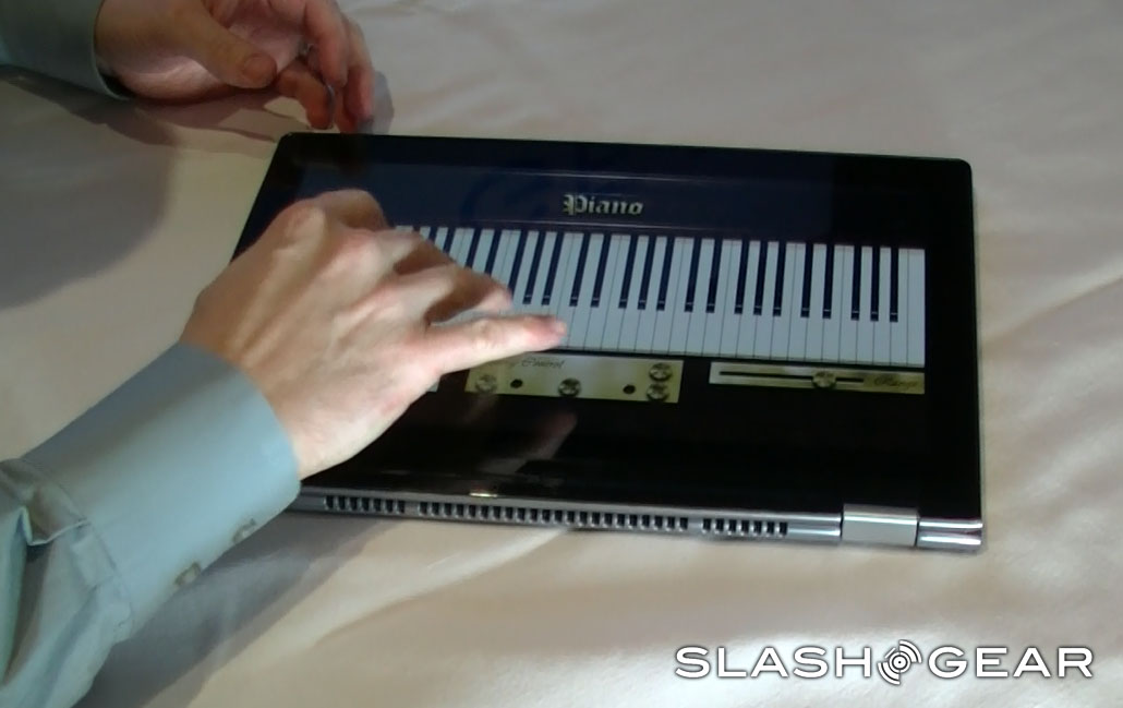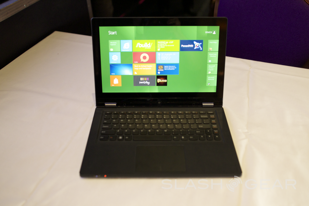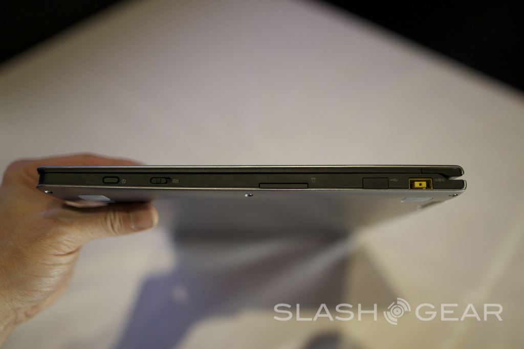 Controls for power and volume are located only on the book-style edge, making control in tablet mode possible. When the dual hinge goes past 180 degrees, the laptop keyboard (now facing down) is disabled. Standard Ultrabook internals power the Yoga, with Intel Core i3/i5/i7 and as much as 256GB of SSD storage.