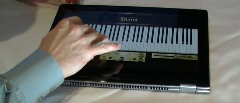 Controls for power and volume are located only on the book-style edge, making control in tablet mode possible. When the dual hinge goes past 180 degrees, the laptop keyboard (now facing down) is disabled. Standard Ultrabook internals power the Yoga, with Intel Core i3/i5/i7 and as much as 256GB of SSD storage.
