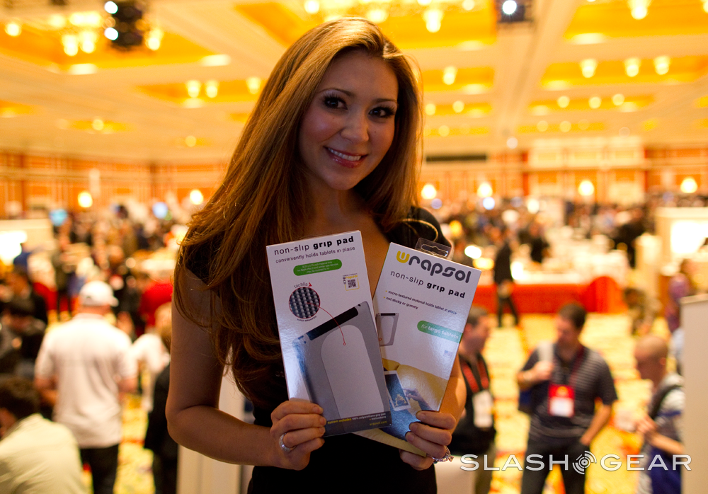 We were here at ShowStoppers 2012 in CES with Wrapsol. Today they unveiled the Wrapsol non-slip grip pad. We've seen products that do essentially the same thing before, but not with their superb 'tactile' technology. Tactilla isn't velcro or adhesive. It creates a wider surface area and tension so that i can even grip clothing.