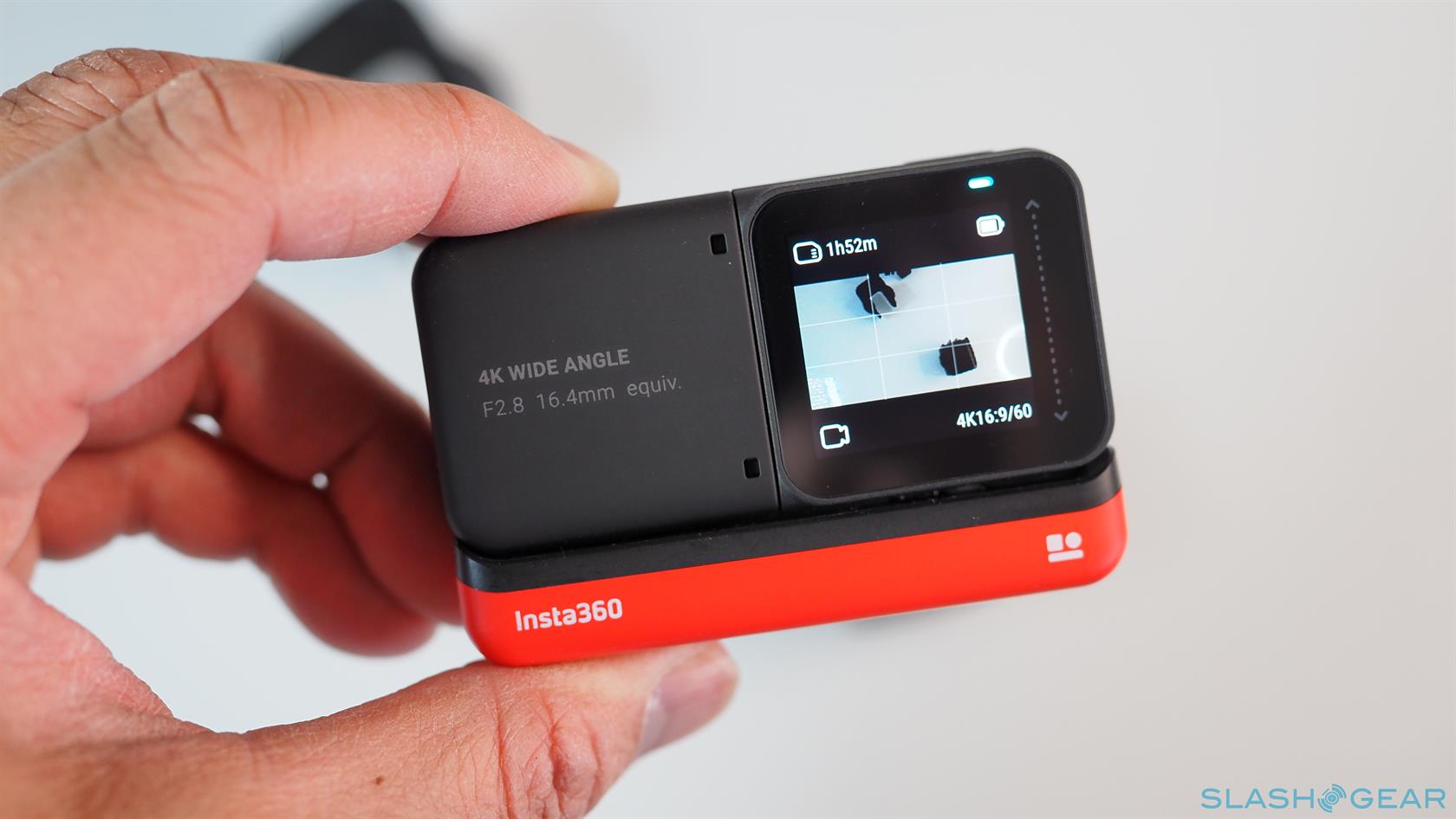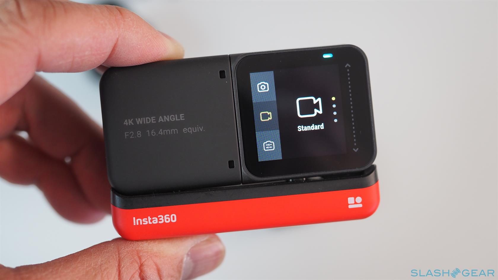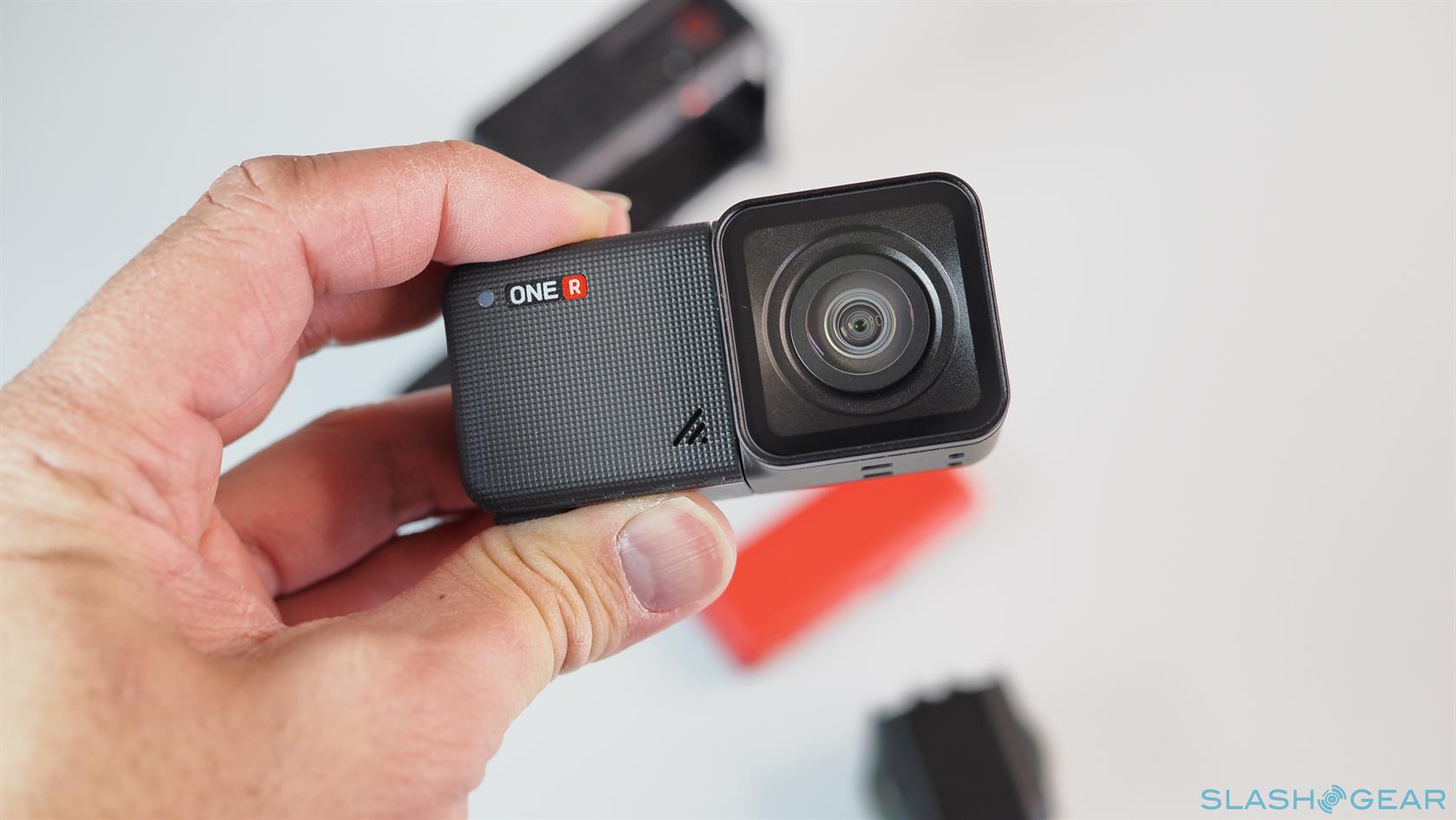The Insta360 ONE R doesn't actually have all those features in a single body. In fact, the ONE R technically doesn't have a camera at all or even a battery. The small black box that makes up the core of the setup houses the electronics for processing images and videos while the red base serves as the power source. The Core, however, only takes up half of the battery base and leaves the other half for the quick-switch lens mods that complete the formula.