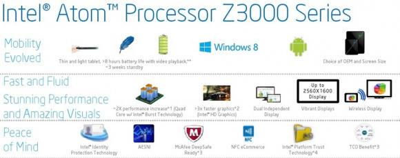 Z3000-class processors will be appearing in dual-core or quad-core iterations with up to twice the CPU performance of comparable ARM mobile processors at the same time as they out-perform the competition in graphics performance by x3. That's Intel's suggestion, mind you – we'll have to test it all out on our own to confirm, as always. The most powerful SoC to come out of this generation of builds will be the Z3770 – this system-on-chip will bring on resolutions up to a cool 2560 x 1600 pixels with clock speeds at up to 2.4GHz a core.