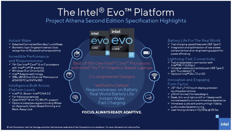 When it comes down to the nitty-gritty, Intel Evo branded notebooks will all have Core i5 or i7 processors. They'll all use Intel Iris Xe graphics, and have WiFi 6 (Gig+) and Thunderbolt 4.