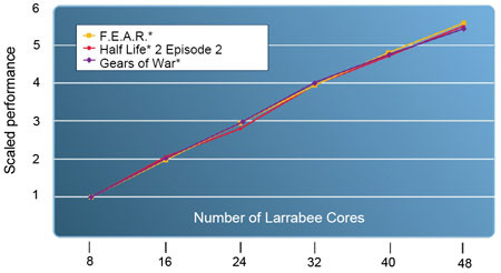 The actual number of cores could range from 8 to 48, although Intel would not be drawn on exactly how many they will include to begin with. Estimates suggest an 8-core entry-level Larrabee chip launching in 2009, with more complex versions rolling out after that. Performance scales, supposedly, almost linearly, meaning a 16-core Larrabee CPU will perform almost twice as fast as an 8-core version.